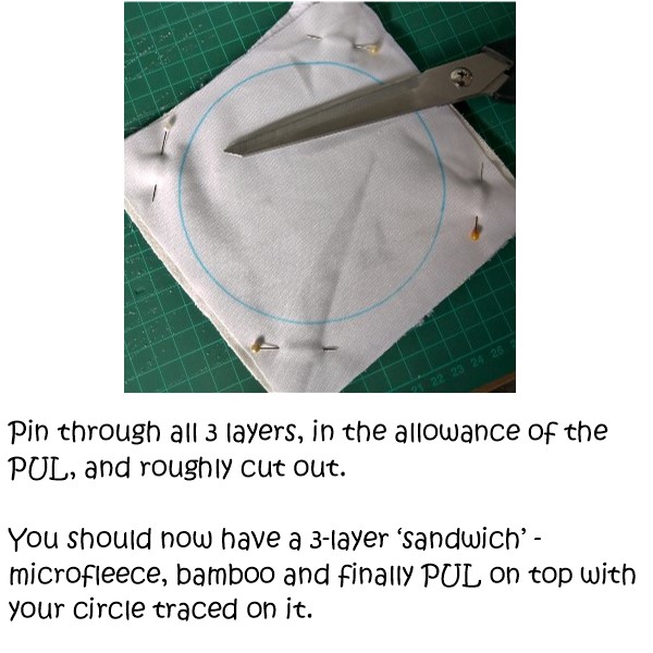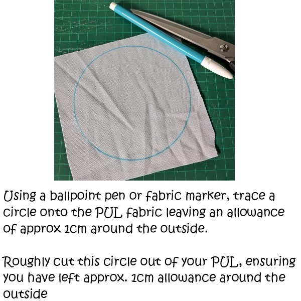 - Roughly cut this circle out of your PUL, ensuring you have left approx. 1cm allowance around the outside