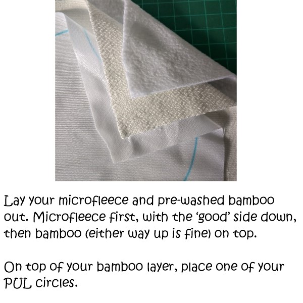 - On top of your bamboo layer, place one of your PUL circles. Pin through all 3 layers, in the allowance of the PUL, and roughly cut out. You should now have a 3-layer ‘sandwich’ - microfleece, bamboo and finally PUL on top with your circle traced on it.