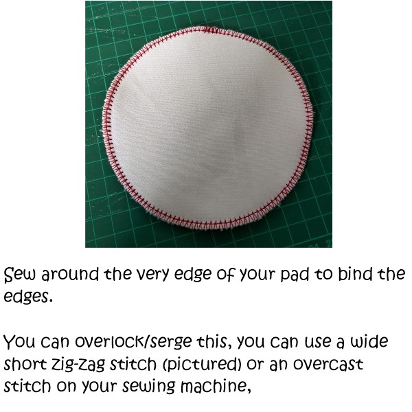 - Finish your pad. Sew around the very edge of your pad to bind the edges. You can overlock/serge this, you can use a wide short zig-zag stitch or an overcast stitch on your sewing machine, or you can sew by hand with a blanket/binding stitch.