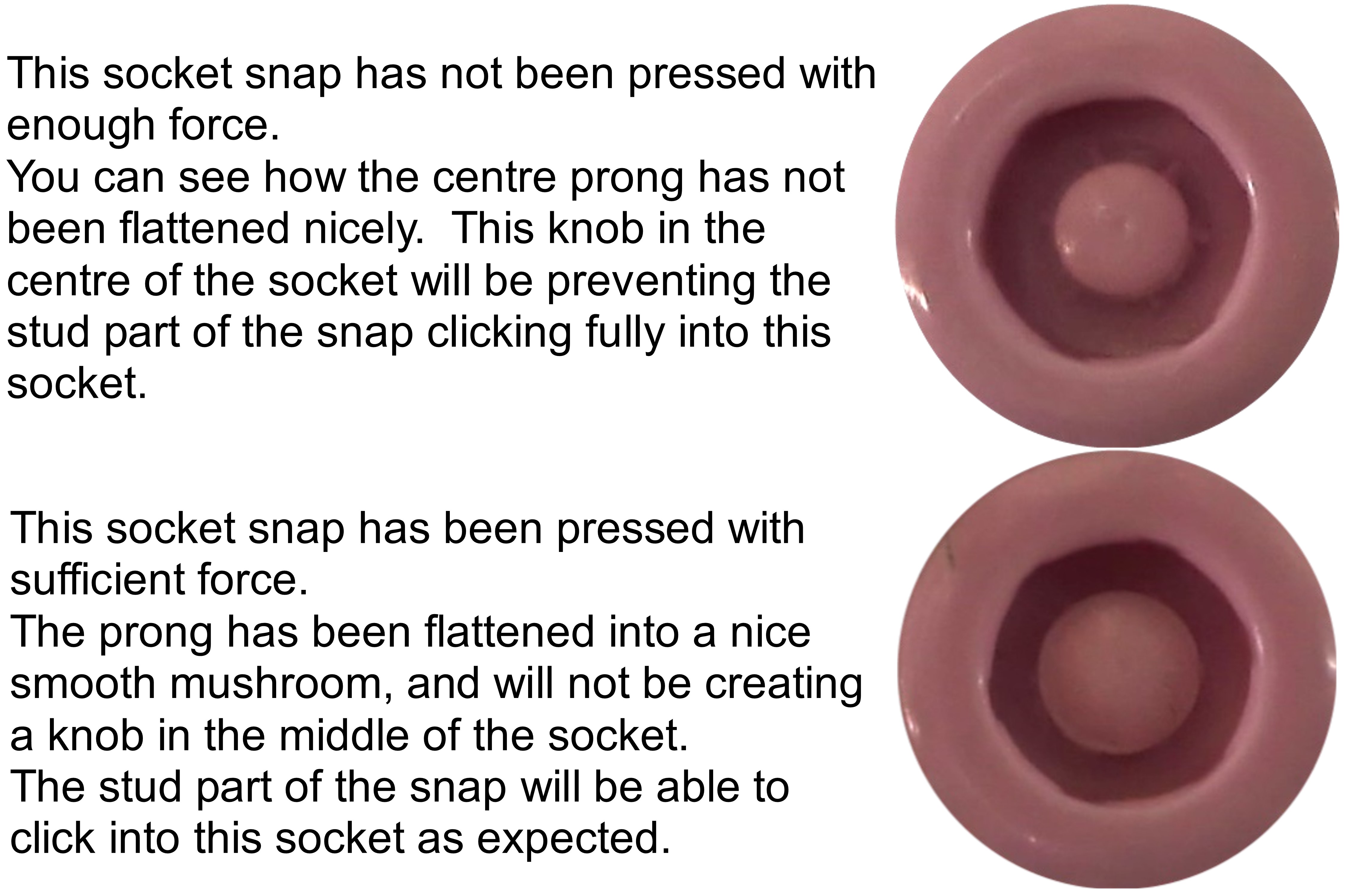 - Push the handle down firmly, which brings the top (socket or stud) piece down onto the fabric. You need to push down hard enough that the centre prong of the cap piece is being crushed into the socket or stud snap piece.